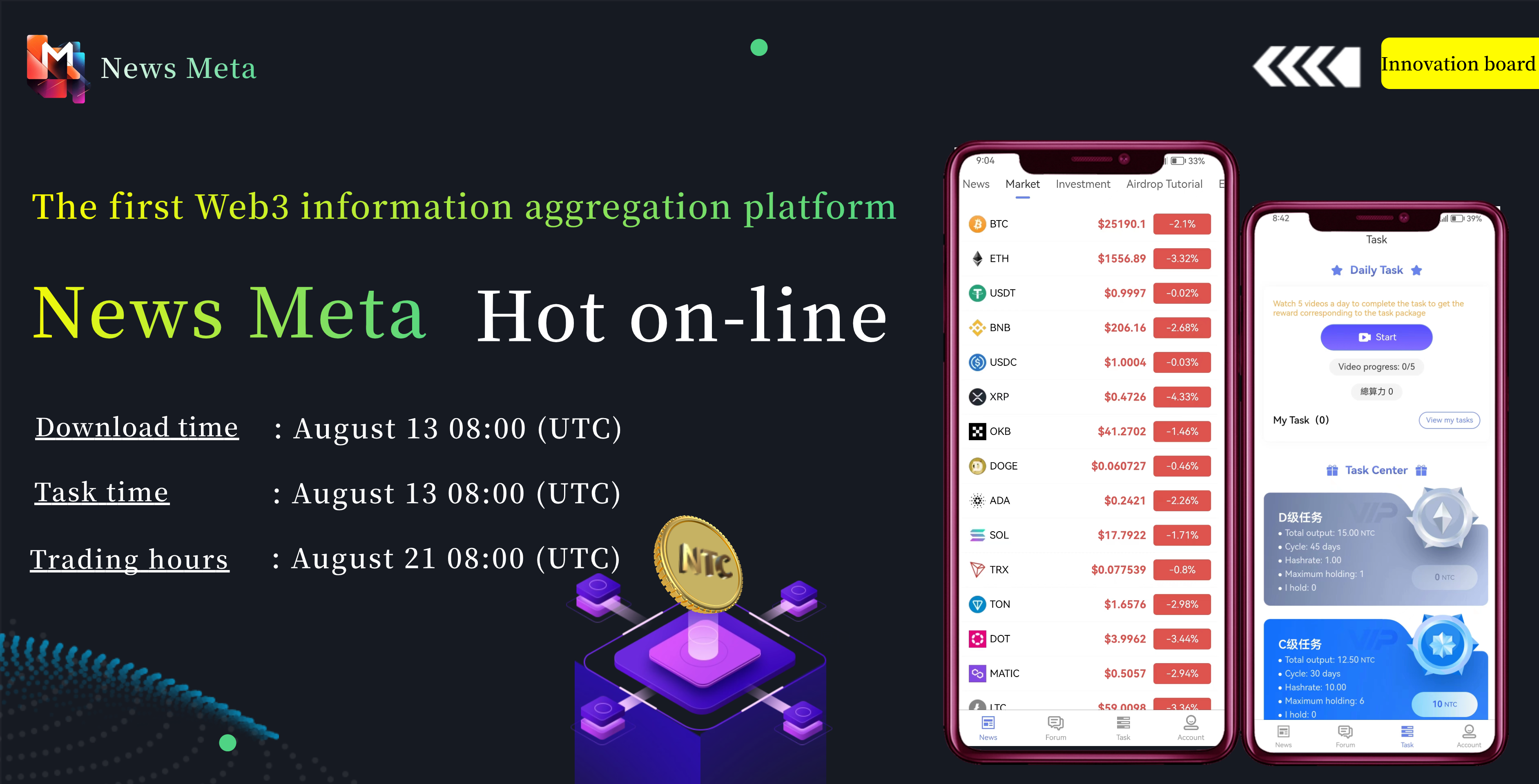 NEWS META,首个基于Web3.0技术框架的资讯聚合平台,将于北京时间9月13日16:00正式上线。